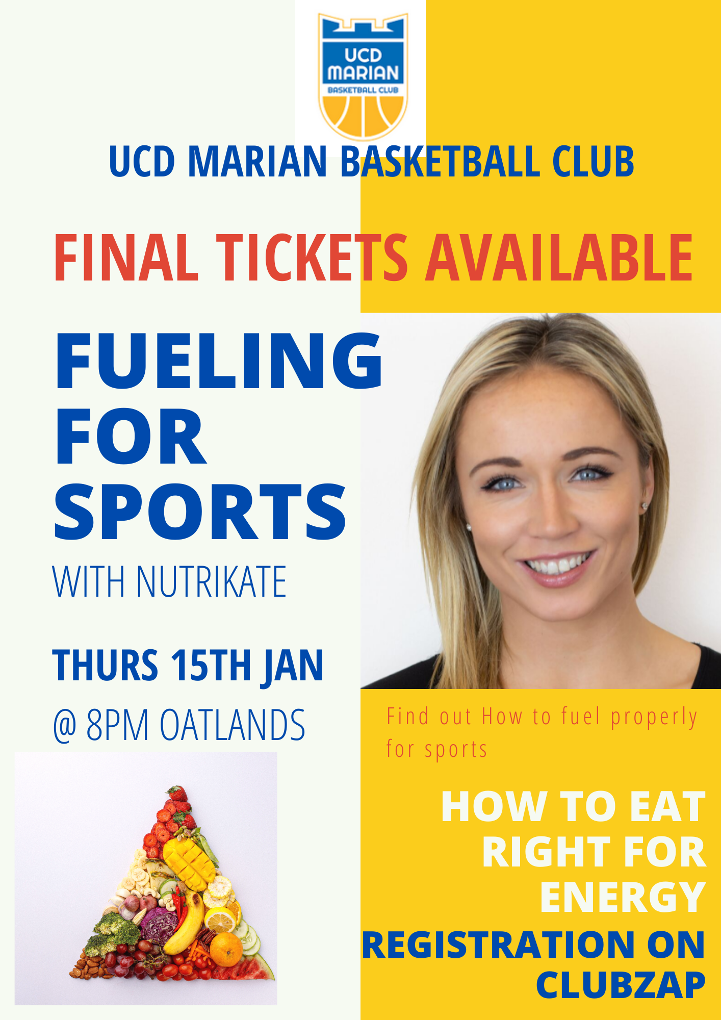 Evening talk at 8pm on 15th January at the Sports Hall, Oatlands College with Kate Mc Daid, Nutritionist on fueling properly for sports. The event is open to all players, coaches, managers and parents/guardians.